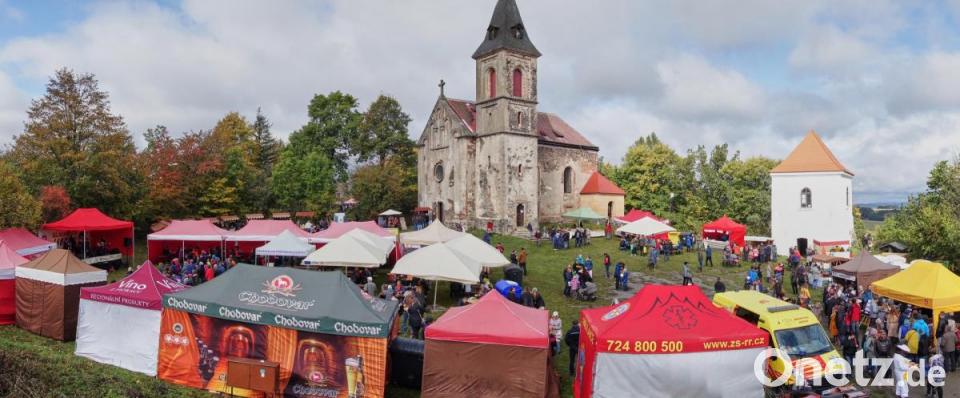 Der Berg Krasikov (Schwanberg) mit seiner Burgruine und Kirche in der tschechischen Gemeinde Kokasice ist jedes Jahr eine herrliche Kulisse für das Apfelfest. Der Ort liegt in der tschechischen Mikroregion Konstantinsbad, die Partnerregion der Steinwald-Allianz.