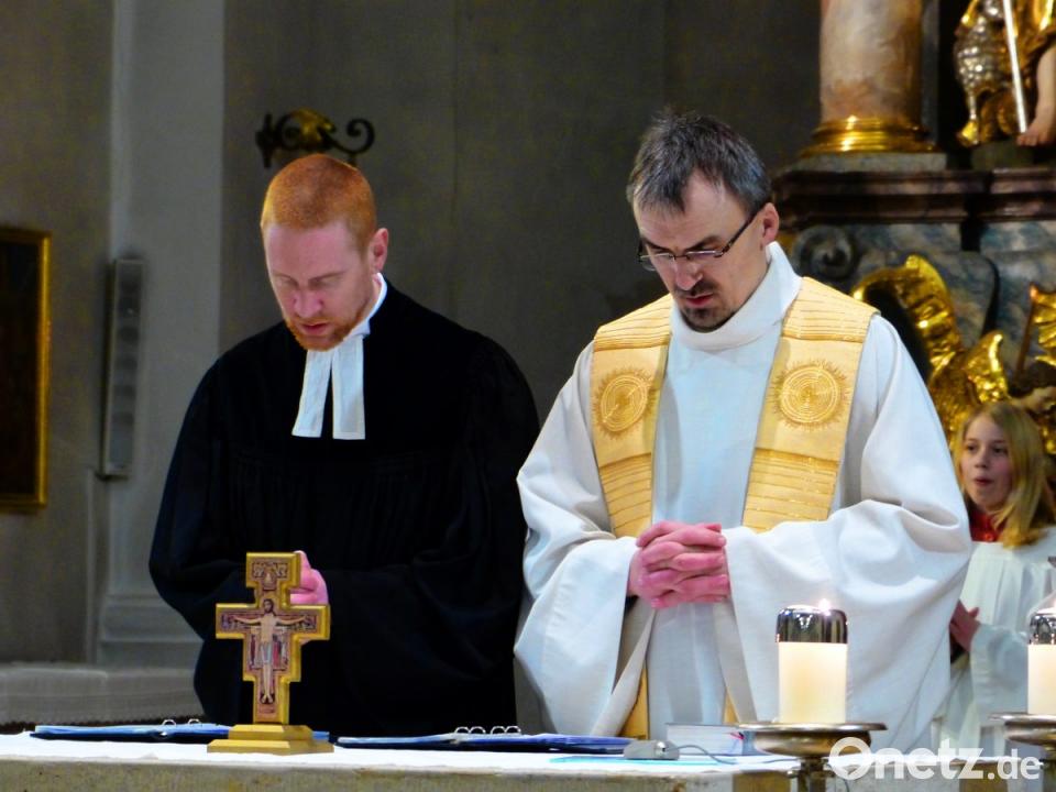 "Hausherr" Pfarrer Martin Besold begrüßte zur Eröffnung des Gottesdienstes zahlreiche Gläubige der beiden örtlichen Kirchen in der katholischen Pfarrkirche Mariä Himmelfahrt. Besonders freute er sich auf seinen Mitzelebranten Pfarrer Christoph Zeh.