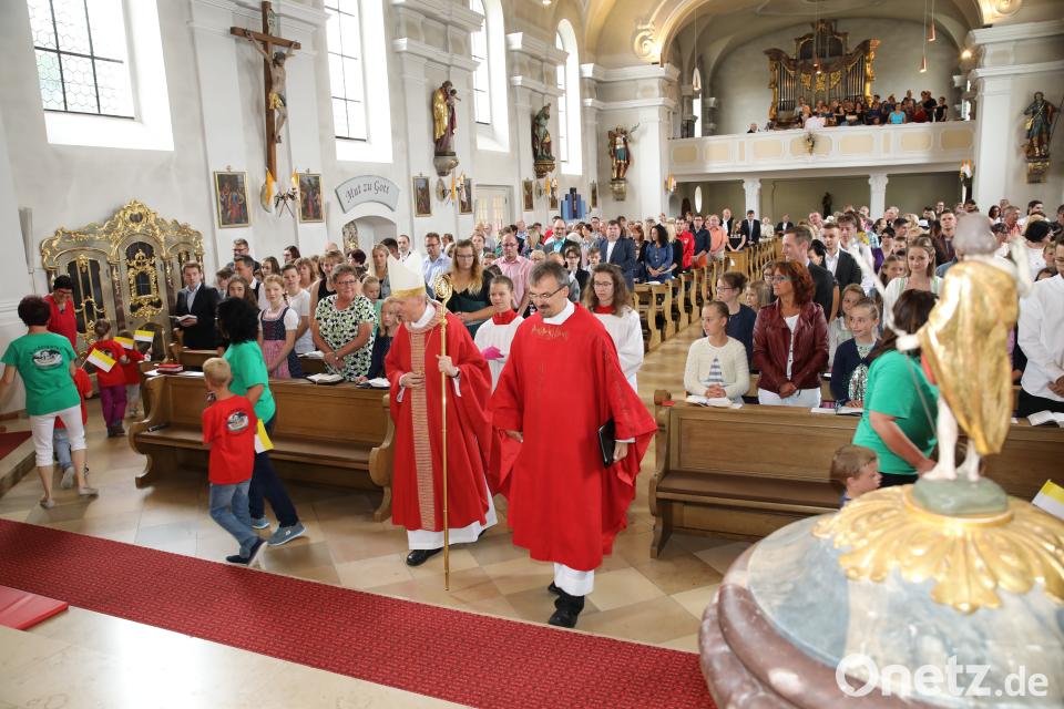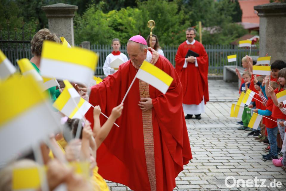 (njn) Mit Fähnchen in den Kirchenfarben Weiß und Gelb erwarteten vor der katholischen Pfarrkirche die Buben und Mädchen des Kindergartens St. Elisabeth Weihbischof Reinhard Pappenberger zur Firmung. Mit einem Lied begrüßten sie ihn. Nachdem er jedes einzelne Kind gesegnet hatte, zog der Kindergarten mit dem liturgischen Dienst sowie dem hohen Würdenträger mit Pfarrer Martin Besold in die Mariä-Himmelfahrts-Kirche ein.