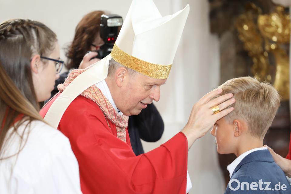 56 Jugendliche hätten sich sehr gut auf das Sakrament der Firmung vorbereitet, erklärte Pfarrer Martin Besold, "Heute erfolgt die Stärkung mit dem heiligen Geist." Er hätte bei der Abfahrt in Regensburg schon ein schlechtes Gewissen gehabt, sollte es in Erbendorf regnen, meinte Pappenberger einleitend in seiner Predigt. "Ob es jetzt geregnet hätte oder nicht, ich habe mir vorgenommen, etwas über Wasser zu sagen." Dabei erzählte er von einer Reise ins Heilige Land vor gut 30 Jahren, als der Weihbischof noch Kaplan war. "Wir sind auf den Spuren Jesu gewandelt und haben den Ort Dominus flevit besucht", was übersetzt "Der Herr weint" heiße. Dabei handelt es sich um eine kleine Kapelle auf dem Ölberg in Jerusalem. "Von dort kann man die Jerusalemer Altstadt mit Grabeskirche und Felsendom sehen."