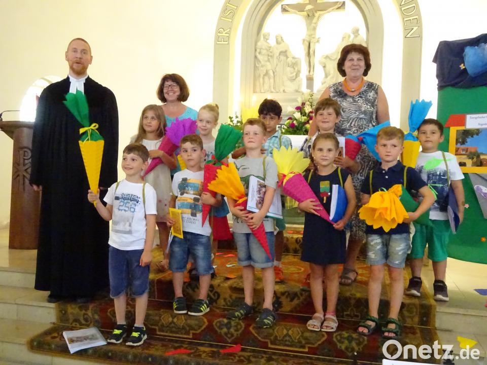 Während der Predigt von Pfarrer Zeh erhielt jedes Kind eine Karte mit „Spuren im Sand“, die sie als Erinnerung mit nach Hause nehmen konnten. Ebenfalls erhielten die Buben und Mädchen von Kindergartenleiterin Brunhilde Minnich ihre Vorschulmappe. Unter dem Lied „Mögen Engel dich begleiten“, das von den Erzieherinnen gesungen wurden, erteilte der Pfarrer jedem Kind den Einzelsegen.