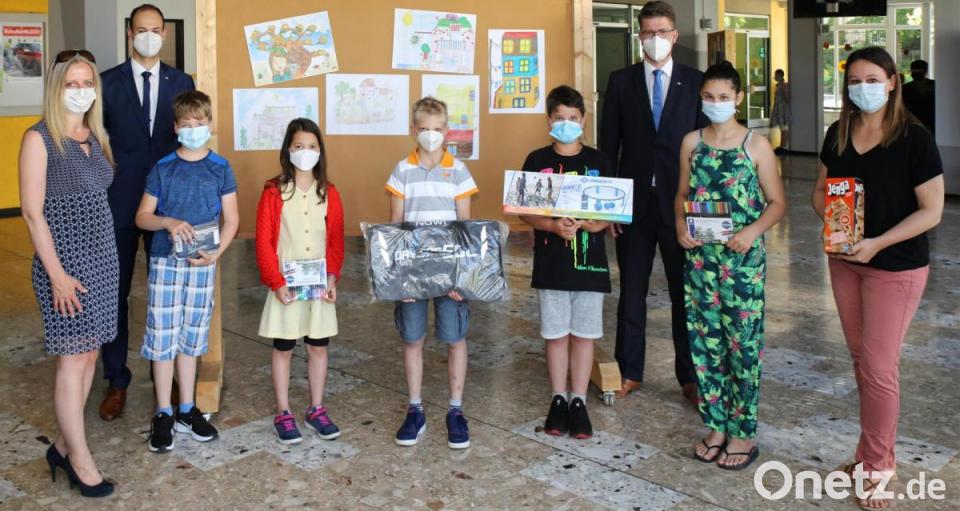 Die Gewinner des Malwettbewerbs (erste Reihe ab zweiten von links) Toni Böckl, Hira Kaya, Timo Wagner, Lika Jannik und Olivia Jackson. Mit auf dem Bild (von links) Rektorin Sabine Graser, die beiden Bankvertreter Victor Hofmann und Alexander Goblisch sowie Lehrerin Kristina Grünauer, den den Preis von Charlotte Berg in Händen hält.