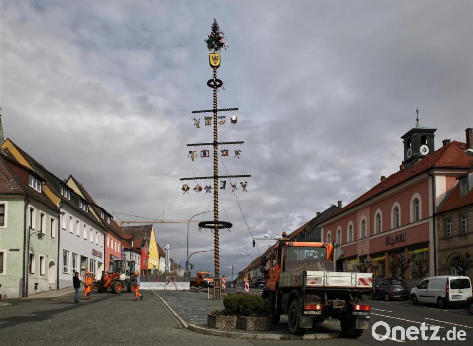 Damit aber trotzdem der gut 23 Meter hohe Maibaum am Unteren Markt die Bürger durch die Sommermonate begleitet, haben die Mitarbeiter des städtischen Bauhofs heuer die Aufstellung übernommen. Mit Radlader und Unimog brachten sie den Baum in die Höhe.
