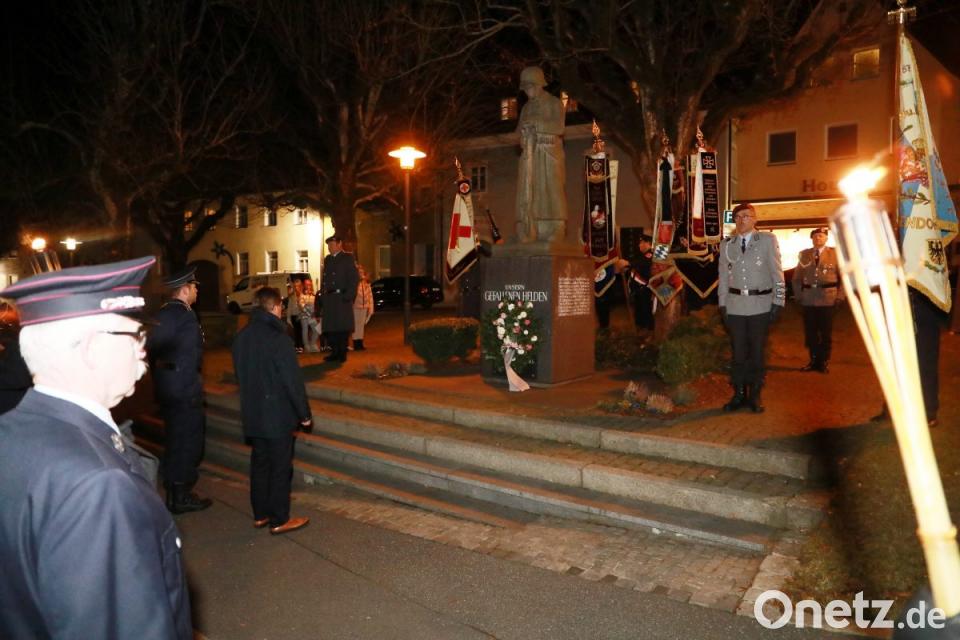 Zuvor hatte der Geistliche in der Pfarrkirche Mariä-Himmelfahrt, den Pfarrer Martin Besold einen Gottesdienst zelebriert. Im Anschluss waren die Vereine und Verbände mit den Fahnenabordnungen sowie dem Stadtrat, angeführt vom Spielmannszug der Feuerwehr und der Stadtkapelle zum Kriegerdenkmal gezogen.
