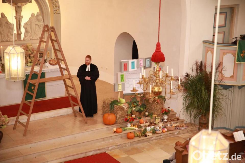 In dem mit einem Erntedankaltar geschmückten Gotteshaus eröffnete der evangelische Posaunenchor musikalisch den Gottesdienst. "Danke, lieber Gott, dass du uns so reich beschenktest", stellte Pfarrer Christoph Zeh fest. "Wir werden daran erinnert, dass Gott es gut mit uns meint." Besonders freute er sich über die vielen Familien und Kinder, die zum Gottesdienst kamen.