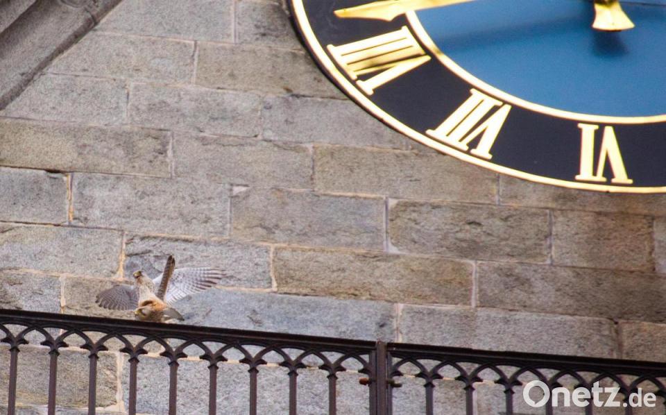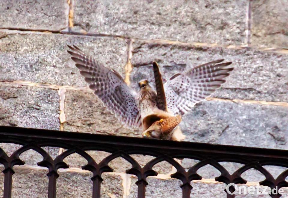 Für die Falken sind die Monate März und April Balzzeit. Herr und Frau Falke turteln dabei ganz ungeniert, wie beispielsweise am Donnerstag um die Mittagszeit. In nicht ganz 30 Metern Höhe suchten sie sich dazu das Geländer des Umgangs aus. Es war im wahrsten Sinne des Wortes ein Balanceakt.