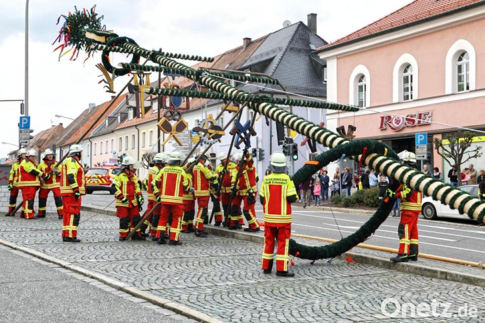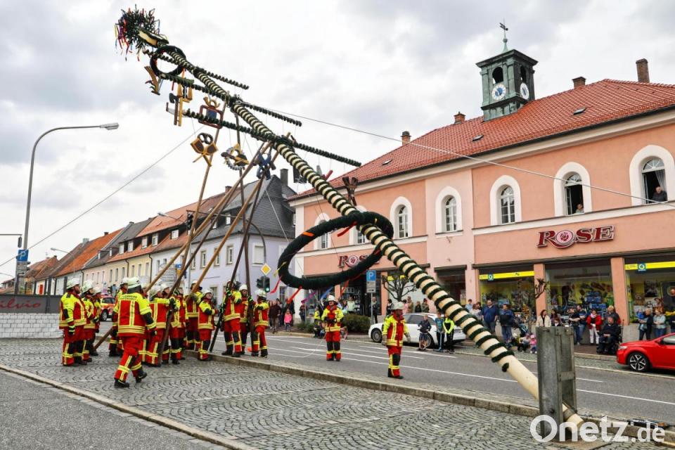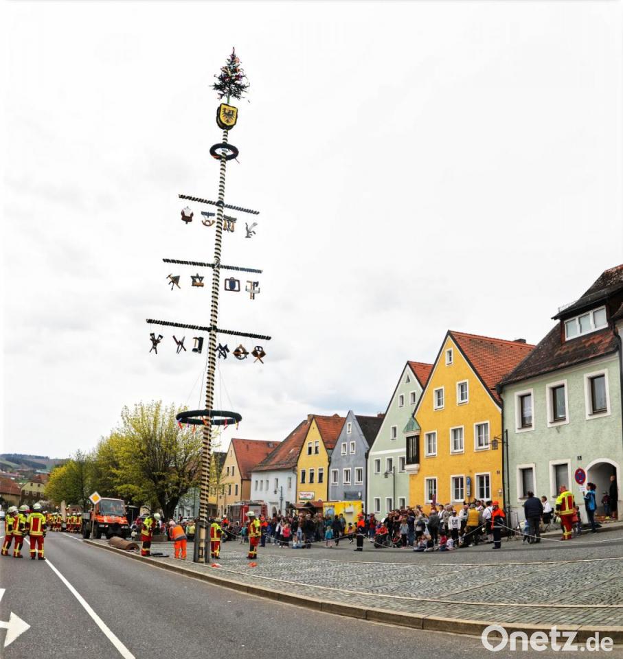 Beinahe Volksfeststimmung herrschte bei der Maibaumaufstellung mit vielen Zuschauern. Nach gut zwei Jahren Corona war es immerhin wieder das erste große Fest in Erbendorf. Bereits am Samstagvormittag bauten die Mitarbeiter des städtischen Bauhofs den Maibaum am Unteren Markt auf. Dabei wurde auch ein nagelneuer Baumstamm verwendet. Denn aus Sicherheitsgründen wurde der alte, gut vier Jahre alte Stamm nicht mehr wiederverwendet. Heuer hat er eine Höhe von knapp 23 Metern.