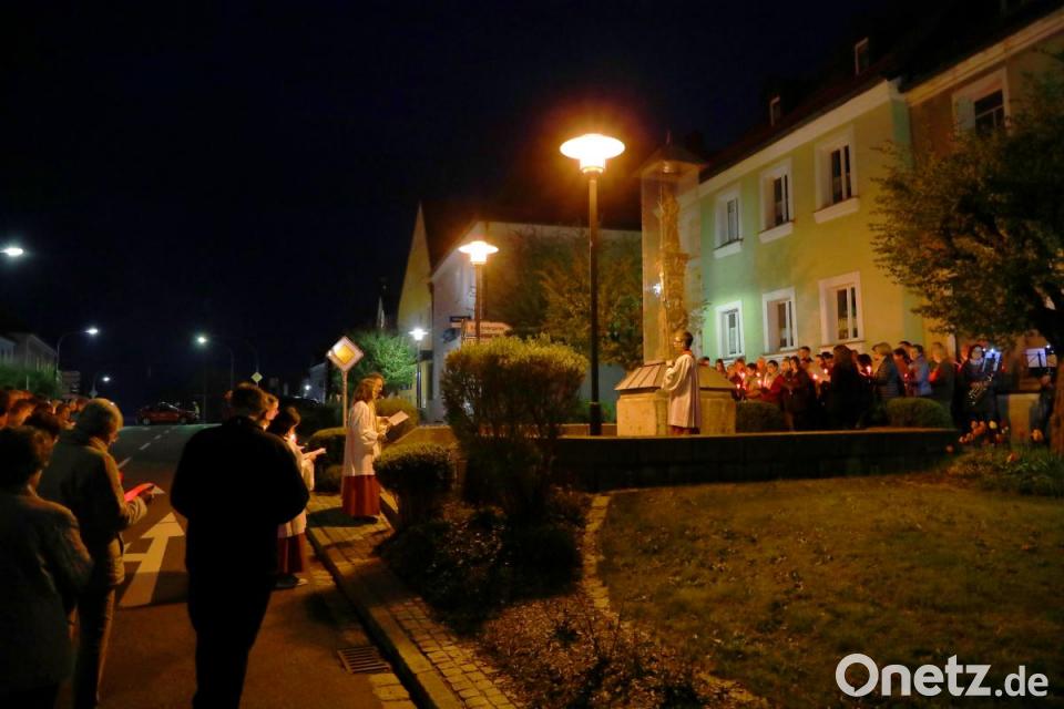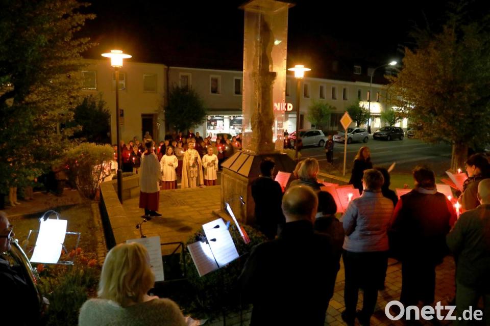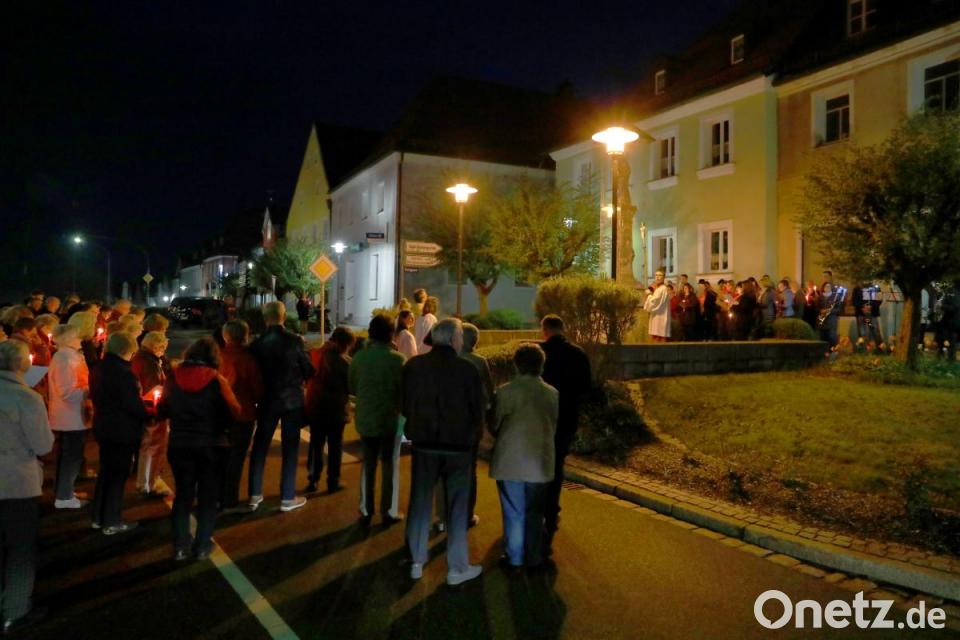 Zahlreich beteiligten sich die Gottesdienstbesucher mit Kerzen ausgestattet an der anschließenden Prozession, die unter den Klängen des evangelischen Posaunenchors über die Frühmeßgasse, Jahnstraße, den Unteren Markt hinauf zur Mariensäule führte. Nach den Fürbitten und Gebeten endete die eindrucksvolle Feier mit dem gemeinsamen Schlusslied „Segne du Maria.“