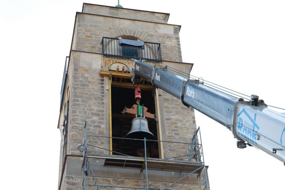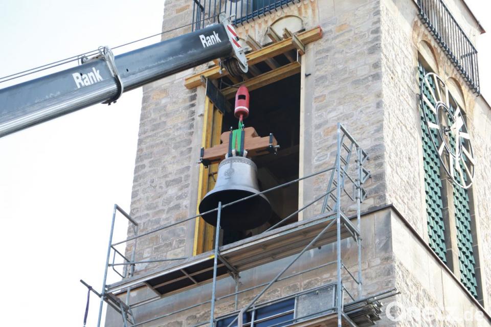 Bevor aber die Glocken einzeln im Turm oben abgesetzt wurden, schlugen Mitarbeiter der Glockengießerei jede der Glocke mit drei Hammerschlägen an.