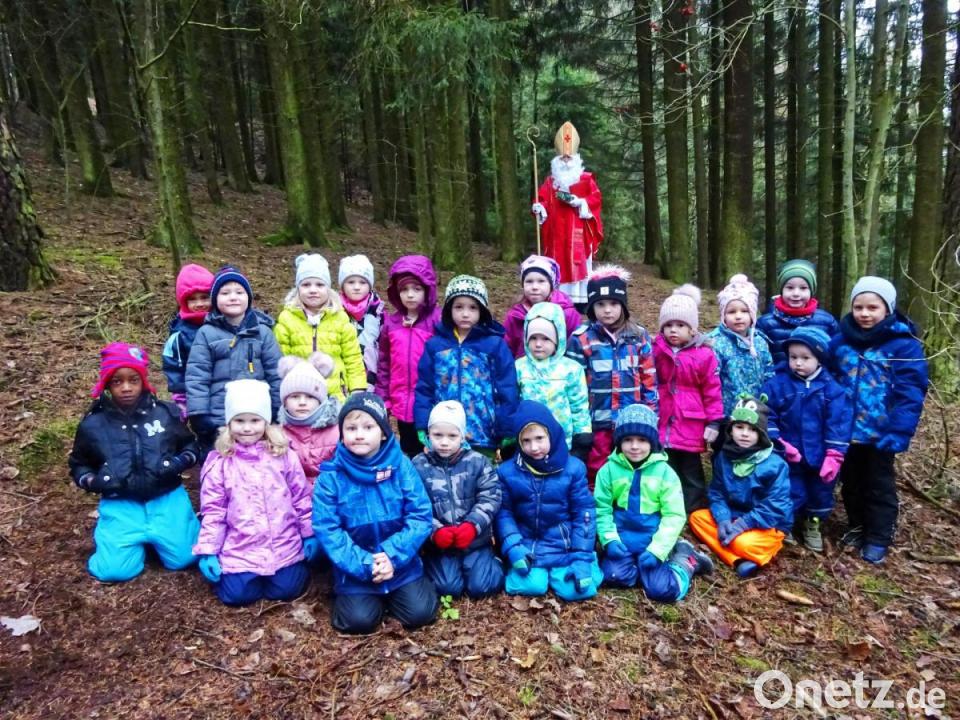Der evangelische Kindergarten "Regenbogen" Erbendorf machte einen Spaziergang ins Grüne. Es war ein frostiger Tag mit etwas Schnee. Während die Kleinen so zwischen den Bäumen tappten, sahen sie etwas Rotes leuchten. Ganz aufgeregt und gespannt waren die Mädchen und Jungen, als sich das Rote als Mantel des Heiligen Bischof Nikolaus entpuppte. Angst hatten die Kinder nicht. Im Gegenteil, sie gingen dem heiligen Mann entgegen.