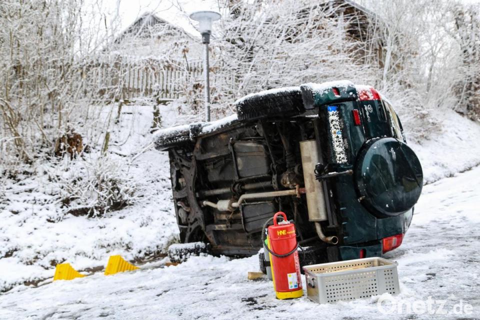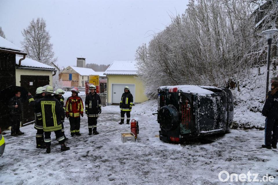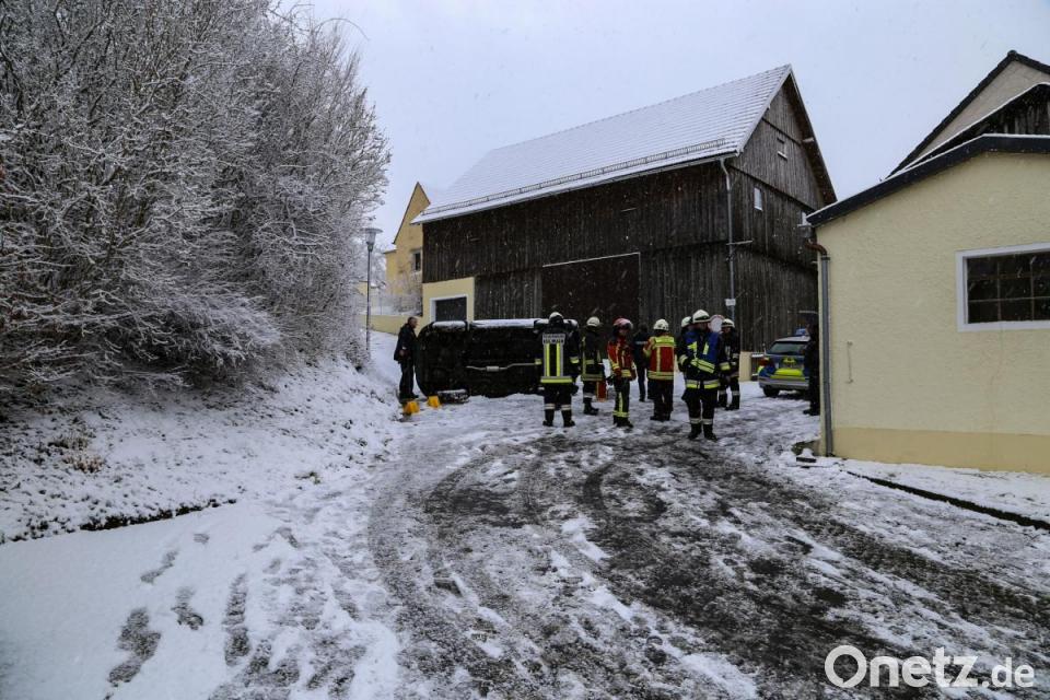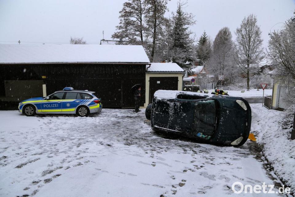 Ein 47-jähriger Autofahrer kam ebenfalls auf einer schneebedeckten Fahrbahn in Kulmain ins Rutschen. Er versuchte noch durch das Heranfahren an eine Böschung rechts neben der Straße seine Geschwindigkeit zu bremsen. Jedoch kippte er durch die steile Böschung zunächst auf die Fahrerseite und im Anschluss überschlug er sich einmal und blieb schließlich auf der Beifahrerseite quer zur Fahrbahn liegen. Der Fahrer wurde leicht verletzt, konnte aber nach kurzer Behandlung des BRK vor Ort wieder entlassen werden.