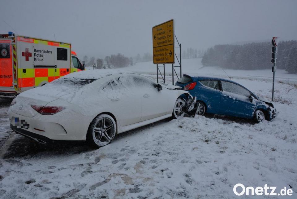 Am morgen kam es wegen Schneefall und Glätte zu drei weiteren Unfällen. In Tirschenreuth rutschte ein Fahrzeug gegen eine Verkehrsinsel, wobei jedoch kein nennenswerter Schaden entstand. Weniger glimpflich ging ein Unfall in der Nähe von Waldershof aus. Ein junge Frau war mit ihrem Auto von Lengenfeld in Richtung Fuchsmühl unterwegs. Sie konnte auf der schneeglatten Fahrbahn vor der Einmündung in die Staatsstraße zwischen Waldershof und Fuchsmühl nicht rechtzeitig bremsen und schlitterte in den Kreuzungsbereich. Ein aus Richtung Waldershof kommender Mercedesfahrer konnte nicht mehr ausweichen. Die Fahrerin wurde mit leichten Verletzungen ins Krankenhaus Marktredwitz eingeliefert. Der Fahrer des Mercedes blieb unverletzt. Die Polizei schätzt den Schaden auf etwa 35 000 Euro.