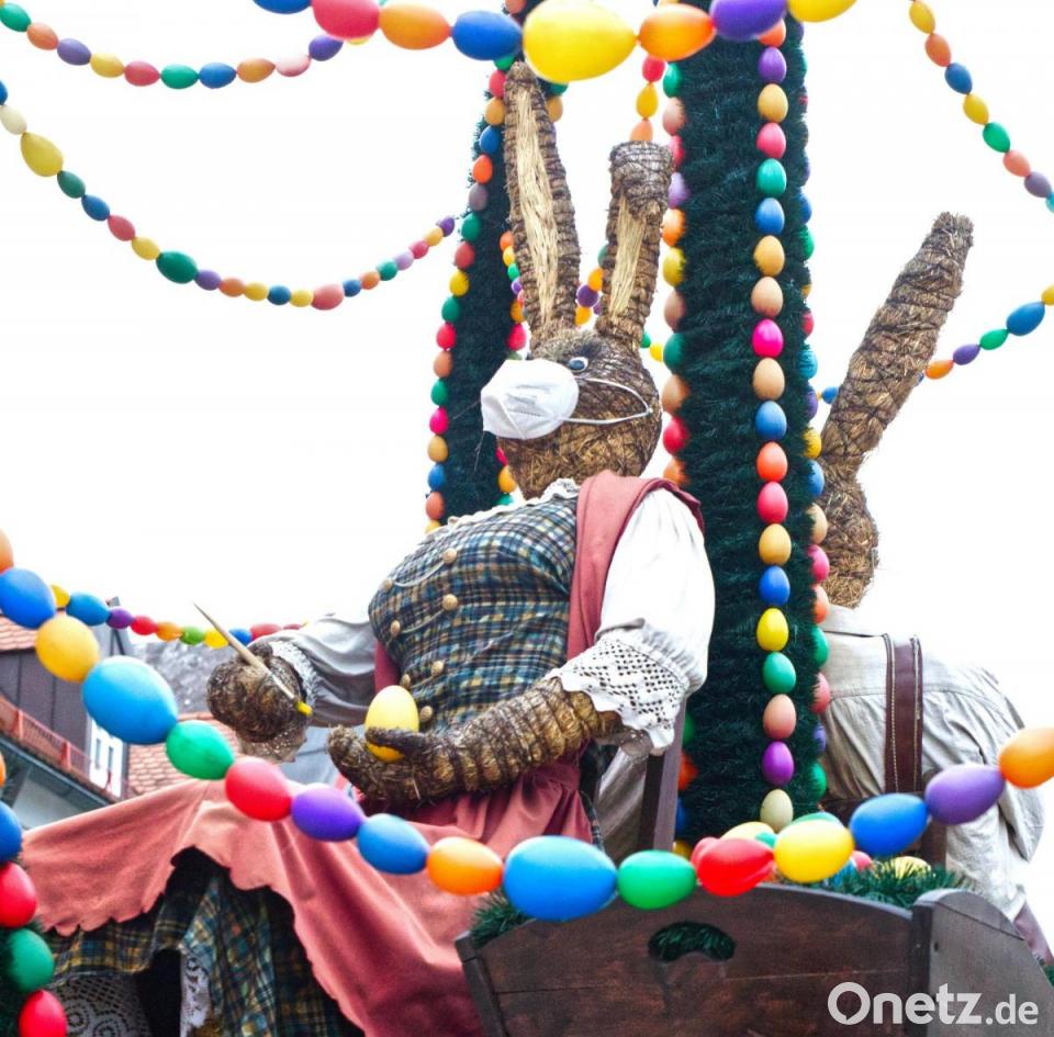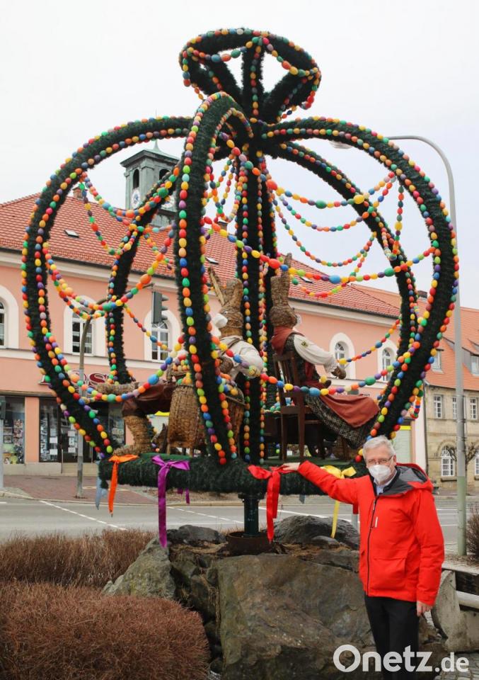 In Vorbereitung auf Ostern waren die Mitarbeiter des Erbendorfer städtischen Bauhofs fleißig: Sie stellten die Osterkrone auf dem Unteren Markt auf. Die Stadt stellt Jahr für Jahr zu Ostern die große drehbare Osterkrone am Unteren Markt auf. Bunt geschmückt mit rund 2000 Eiern. Nicht fehlen dürfen auch die beiden Osterhasen in Tracht. Was heuer aber erst auf den zweiten Blick auffällt: Die beiden Hasen tragen Mundschutz. Bürgermeister Johannes Reger dankte den Mitarbeitern des städtischen Bauhofs für das Schmücken und Aufstellen der Krone. Fehlt nur noch ein schönes Wetter für die kommenden Ostertage, um die Osterkrone bei einem Spaziergang zu bewundern.
