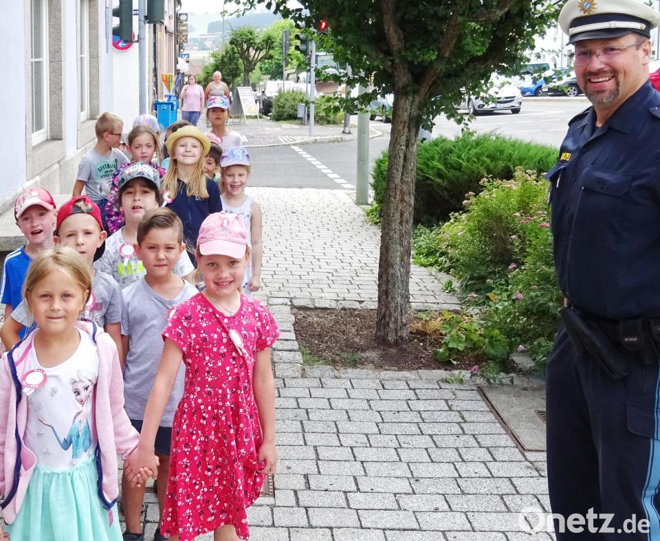Mit Polizeihauptmeister Landgraf wiederholten die Kinder die bereits erlernten Inhalte aus dem Kindergarten. Dazu gehörte das richtige Verhalten im Straßenverkehr und auch das Verhalten gegenüber fremden Personen. Zum Abschluss konnten die Buben und Mädchen ihr angeeignetes Wissen in die Praxis mit einem Rundgang in der Stadt umsetzen, unter anderem die Überquerung einer Straße.