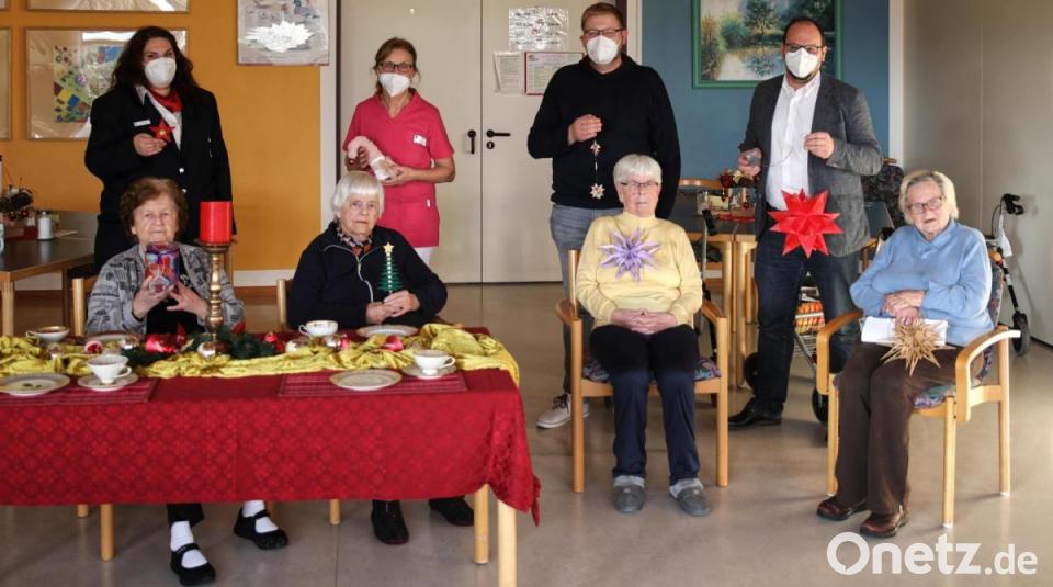 Über die Sterne und andere Weihnachtsbasteleien freuten sich nicht nur die Senioren im BRK-Seniorenwohn- und Pflegeheim in Erbendorf. Mit auf dem Bild die Leiterin Jugendarbeit Stefanie Busch (stehend, links), Heim-Chef Andreas Wöhrl (stehend, rechts) und Pflegedienstleiter Martin Kraus (stehend, Zweiter von rechts).