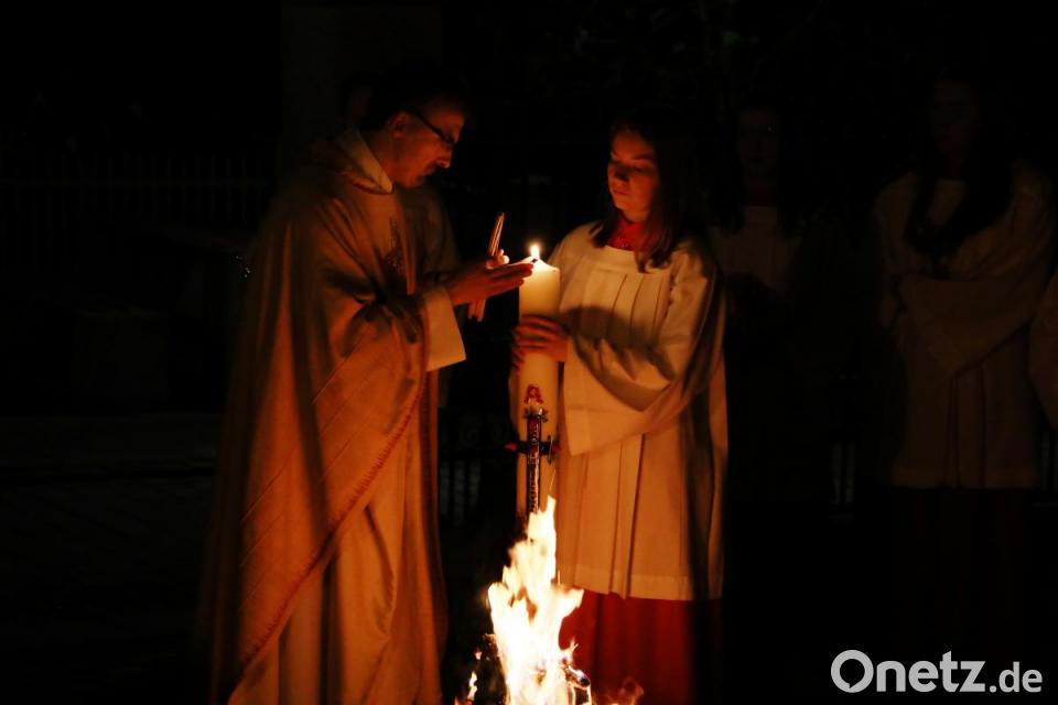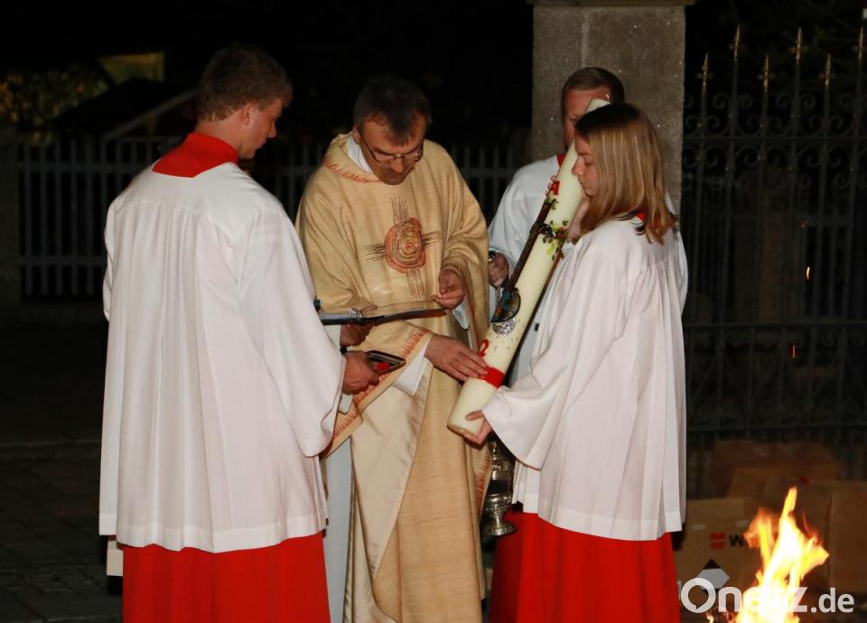 Mit dem dreimaligen Ruf "Lumen Christi" zog Pfarrer Martin Besold mit dem liturgischen Dienst und den Kommunionkindern in die katholische Pfarrkirche Mariä Himmelfahrt ein. Dabei wurden die Osterlichter der Gläubigen entzündet. Mit dem Osternachts-Gottesdienst fand das "österliche Triduum" mit den Messen am Gründonnerstag und am Karfreitag sein Ende.