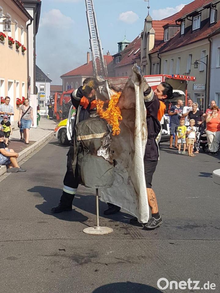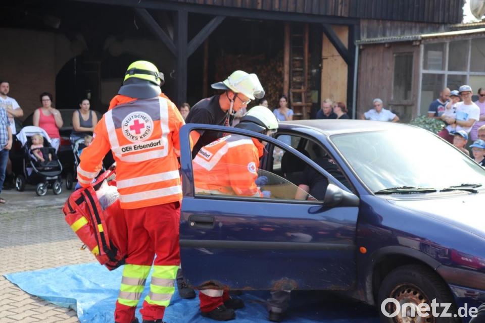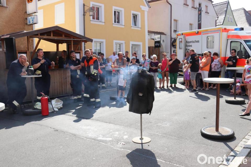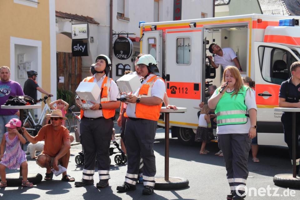 Für interessierte Besucher gab es einiges zu sehen, darunter eine Schauübung, bei der ein Verkehrsunfall mit einer eingeklemmten Person angenommen wurde. Außerdem wurde ein Feuer entfacht, bei dem es um das Löschen einer brennen Person ging. Alle Vorführungen moderierte BRK-Bereitschaftsleiter Sven Lehner.