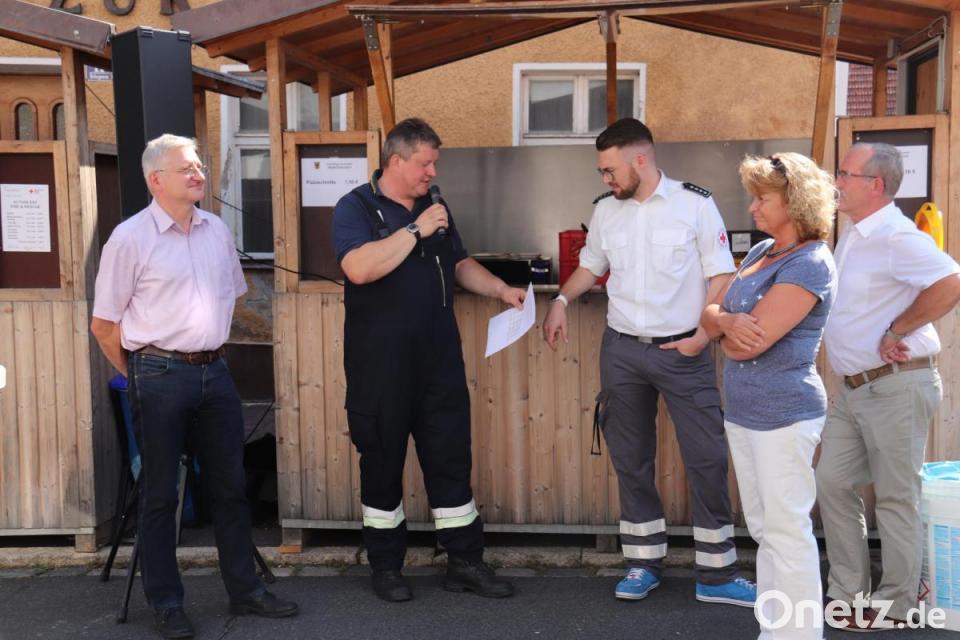 Feuerwehrkommandant Bernhard Schmidt und BRK-Bereitschaftsleiter Sven Lehner freuten sich bei der Eröffnung über die Anwesenheit der beiden Bürgermeister Johannes Reger und Sonja Heindl. Später stießen auch noch Bürgermeister Hans Donko sowie Pfarrer Martin Besold dazu.