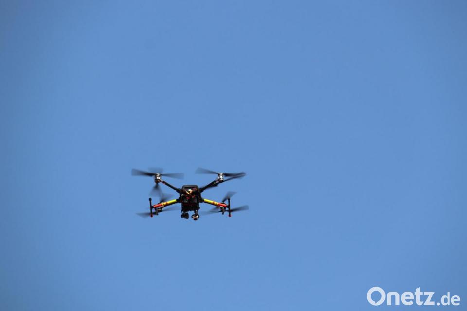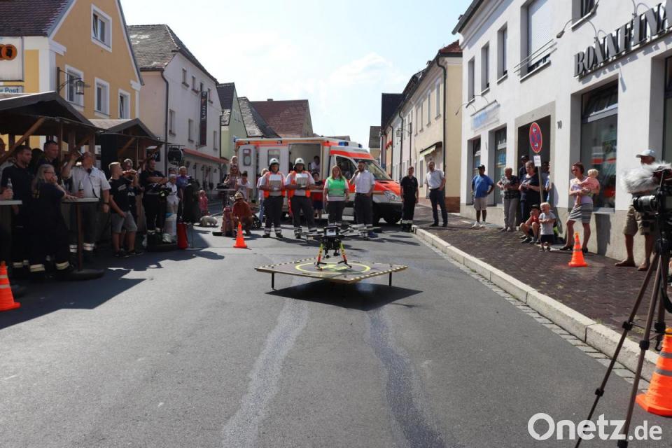 Im Rathausinnenhof baute das BRK seinen "Drohnenstand" auf, bei dem es Informationen rund um den Einsatz des Flugobjekts gab. Einen Live-Einblick in die Arbeit bekamen die Besucher bei der Arbeit der Fachgruppe im Rahmen der Schauübung.