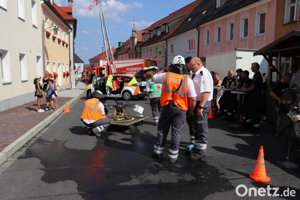 Mit Sirene und Blaulicht startete der gemeinsame Aktionstag der Feuerwehren aus dem Stadtgebiet, der BRK-Bereitschaft, des Jugendrotkreuzes, der Wasserwacht und der BRK-Drohnen-Fachgruppe Unmanned Aerial System (UAS). In der Bräugasse sowie in vielen Innenhöfen waren Fahrzeuge geparkt und Infostände aufgebaut. Es gab an vielen Plätzen Vorführungen.