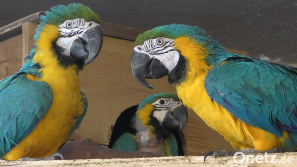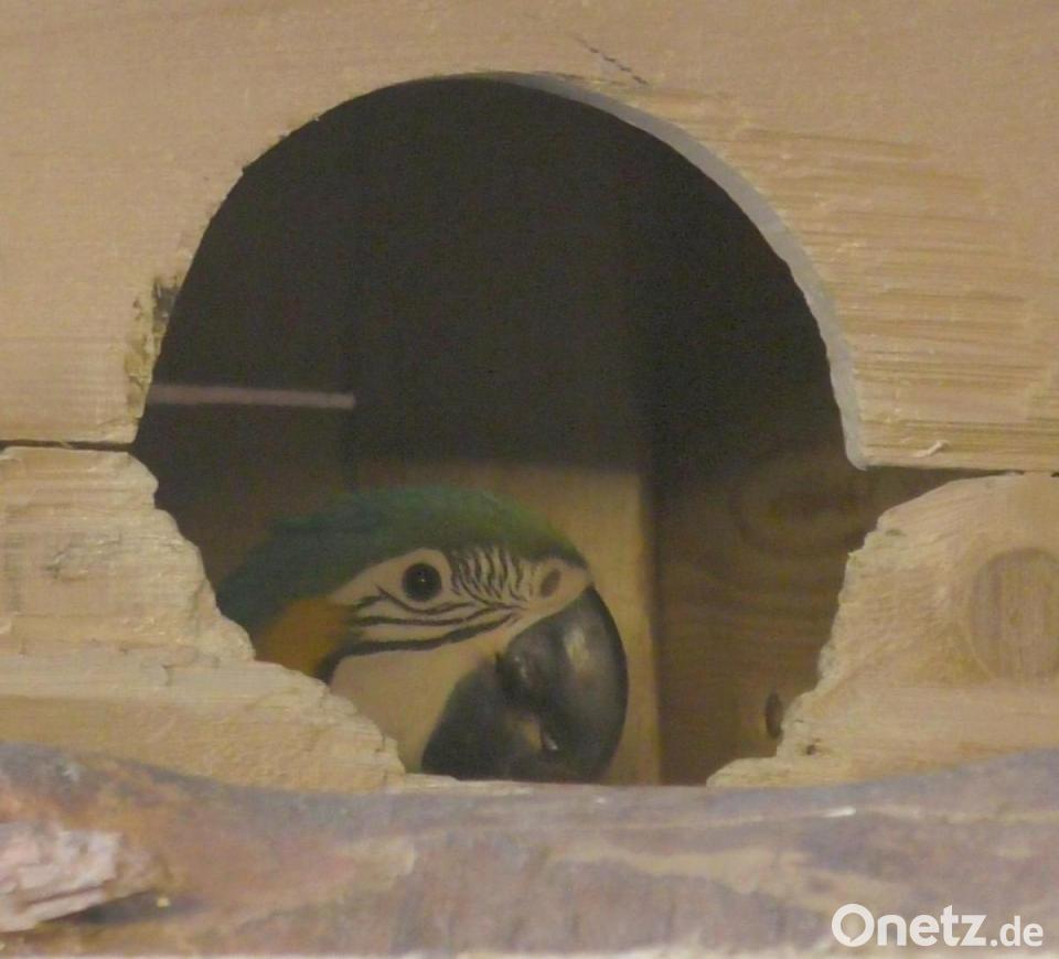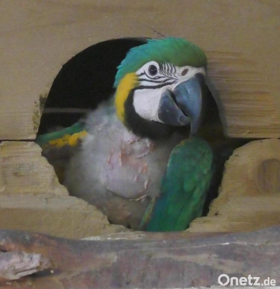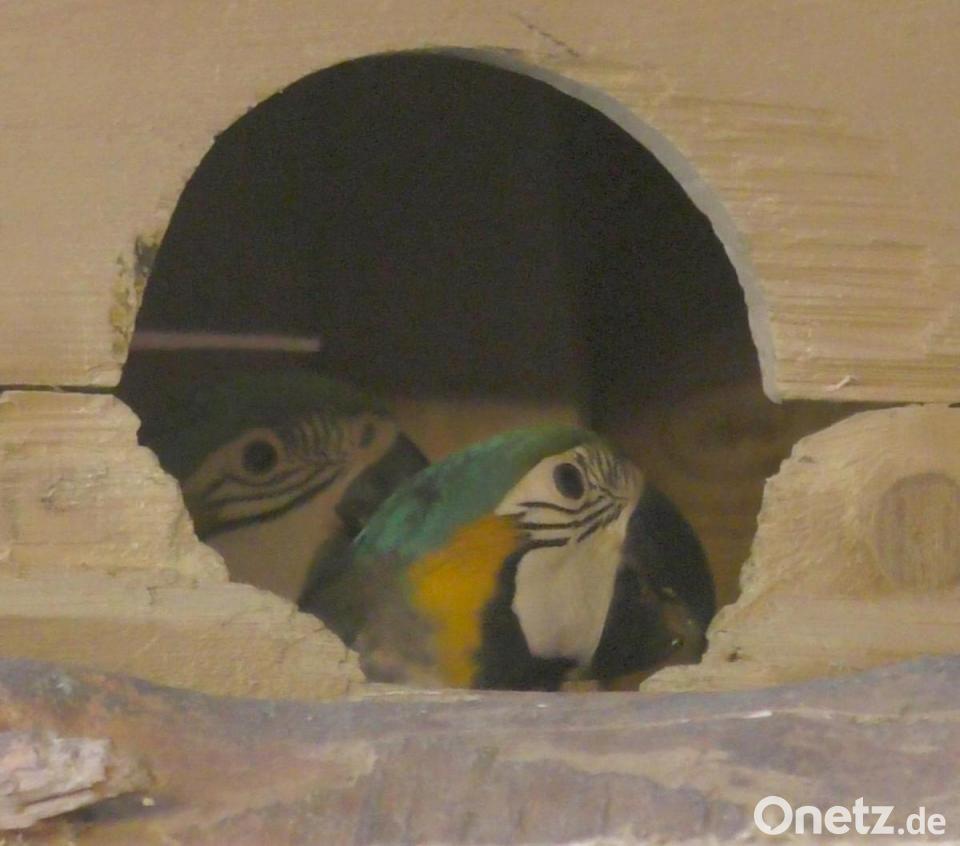 Bisher haben sich die beiden Jungvögel noch nicht getraut, die Höhle zu verlassen. Einer von ihnen, der Mutigere, lugt aber bereits hin und wieder nach draußen: Kopf, Hals und Flügel sind schon genauso bunt gefiedert wie bei seinen Eltern, nur die Brust bedeckt noch ein grauer Flaum. Das andere Junge hält sich meist im hinteren Bereich der Bruthöhle auf und lässt sich selten blicken. Es ist mit Jungpapageien auch wie mit kleinen Kindern, erklärt Charly Beer: Manche sind neugierig und mutig, andere wieder eher ängstlich und zurückhaltend.
