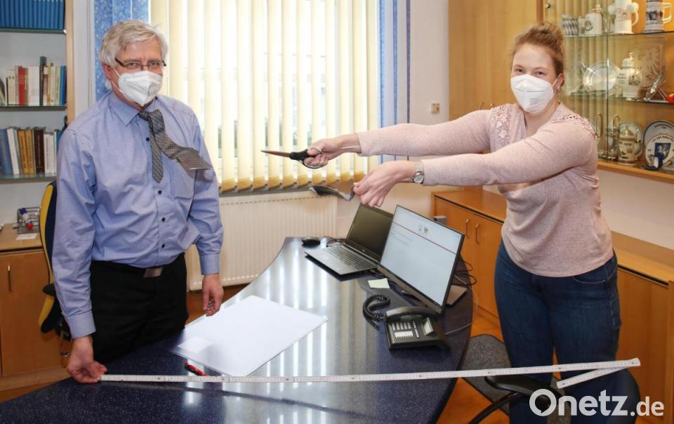 Eigentlich ist es traurig: kein Faschingsgetummel in diesem Jahr, vor allem nicht am unsinnigen Donnerstag. Doch dass ein Schnitt mit geschärfter Schere durch die Krawatte auch mit Abstand funktioniert, zeigte sich bei Bürgermeister Johannes Reger: Vor lauter Corona wäre der unsinnige Donnerstag heuer fast untergegangen. Von Faschingsstimmung ist weit und breit nichts zu spüren. Und Bürgermeister Johannes Reger trug am Donnerstag wie gewohnt eine Krawatte. Rathausmitarbeiterin Carolin Böckl hatte doch einen kleinen Funken Faschingslaune am „Weiberfasching“: Nicht nur mit der Schere, zusätzlich heuer auch mit einem Zollstock, stürmte sie das Amtszimmer des Bürgermeisters. Mit dem richtigen Abstand und lang gestreckten Armen schnitt sie Regers Krawatte entzwei. Reger nahm es gelassen: „An Traditionen muss man festhalten - wenn auch mit Mindestabstand.“