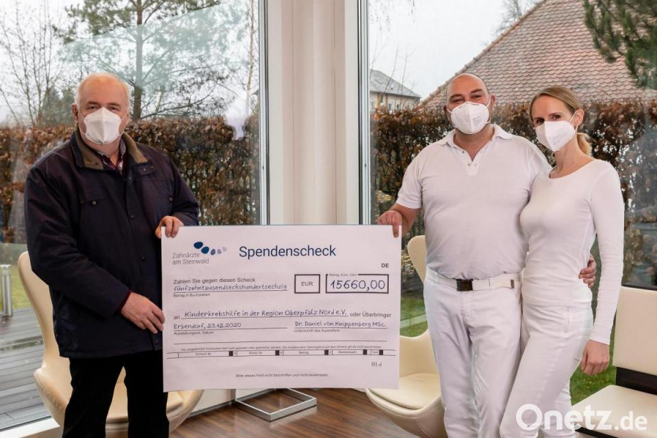 Pünktlich kurz vor Weihnachten konnte Dr. Daniel von Knippenberg, MSc und die Praxis „Zahnärzte am Steinwald“ einen Scheck über 15.660 € an den ersten Vorsitzenden Herbert Putzer überreichen. Zwei Jahre lang wurde dafür das Altgold gesammelt. Daher gilt der besondere Dank all die vielen Patienten, die auf freundliche Bitte hin, fast ausnahmslos sich bereit erklärten ihr Altgold für die Spendensammlung den Zahnärzten am Steinwald zu überlassen. Ebenso besonderer Dank an die Edelmetall-Scheideanstalt Bruno Welz, die sich sofort bereit erklärten, die Aufbereitung umsonst zu übernehmen.