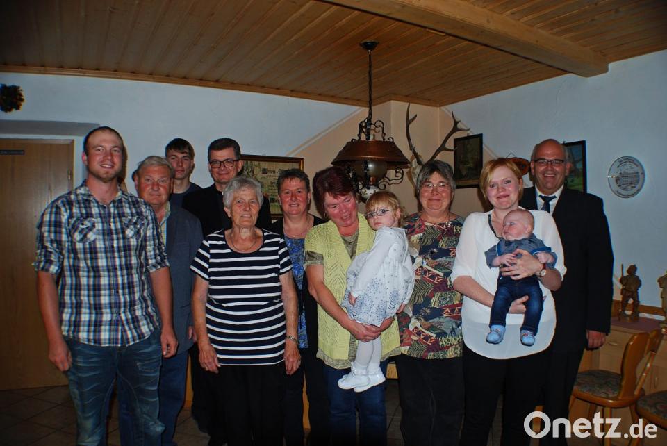 Zum 80. Geburtstag von Maria Ott (vorn, Zweite von links) gratulierten: Bürgermeister Klaus Meyer, Enkelin Stefanie Waidhas mit Urenkel Simon, Tochter Helga Ott, Tochter Inge Köhler mit Urenkelin Leonie, Tochter Petra Wild, Pfarrer Jazek Mizak, Enkel André Wild, der Seniorenbeauftragte Franz Danhauser und Enkel Daniel Ott (von rechts).