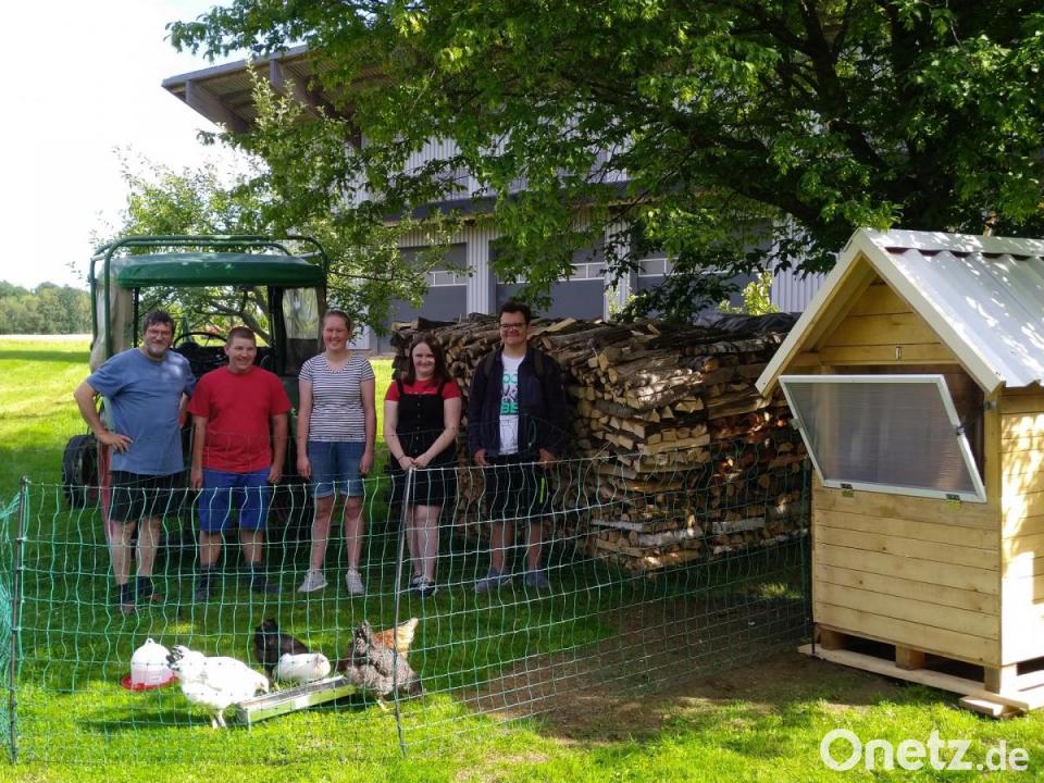 „Den Aufwand und die Arbeitsstunden haben wir gerne auf uns genommen, weil unser Lehrer immer hinter uns Schülern stand und nie die Hoffnung verloren hat, uns zu gestandenen Frauen und Männer auszubilden.“ Natürlich war die Freude bei der Übergabe riesig. Die fünf Ehemaligen kamen auch nicht mit einem leeren Hühnerstall nach Erpetshof, sondern mit vier Hühnern samt Hahn. Wiesent strahlte angesichts dieser Überraschung übers ganze Gesicht und die Schenkenden wussten, dass sie hundertprozentig seinen Geschmack getroffen hatten. Sogar den Freilauf bauten die Schüler beim Anwesen Wiesent auf dem Gartenareal auf und natürlich gab es dazu eine technische Einweisung obendrauf. Wiesent lud die Gäste spontan zu einem Würstlessen ein. „Eine Eierspeise gab es leider noch nicht, weil unsere Hühner erst nach ein paar Wochen Eingewöhnungszeit das erste Frühstücksei liefern werden“, schmunzelte Corinna Beierl.