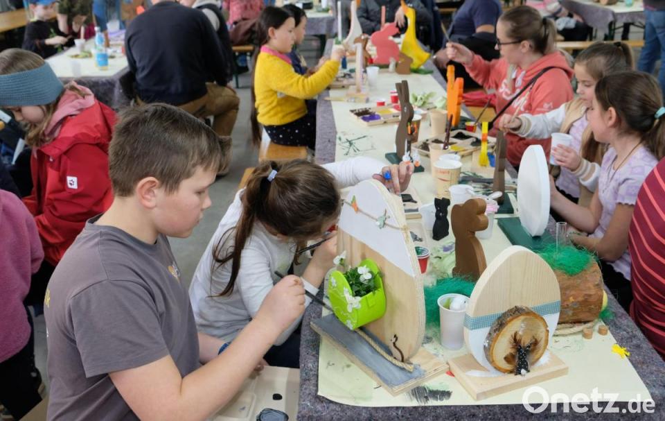 Das Osterbasteln in der Halle des Züchterheimes hat beim Eschenbacher Kleintierzuchtverein Kultcharakter. Am Samstagnachmittag kamen über 100 Kinder, Eltern, Omas und Opas aus der gesamten Region. 120 von Züchter Hans Kneidl in Form gesägte Figuren aus Sperrholz und Holzbretter bildeten die Grundlage des Werkelns. Es entstanden kunterbunte Ostereier und -hasen, Hühner und Lämmer, rustikale Baumscheiben und viele originelle Dekosachen.