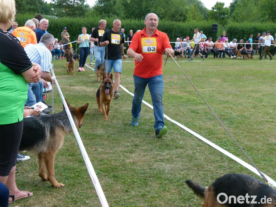 Vor einer großen Zuschauerkulisse glich dann das weitere Prüfungsgeschehen einer Präsentation auf dem Laufsteg. Mit dabei waren "Pia Kenola" aus Kattowitz/Polen, "Arela Navaro" aus Prag, "Georgia Aukstagirio Aidas" aus Vilnius/Litauen, "Joydel Vetos Margio" aus Griechenland, "Hana Team Schwarze Engel" aus Zagreb/Kroatien und "Nikita de L'etang de Freville" aus Frankreich. Wesenssicheres und selbstsicheres Auftreten waren ebenso Wertungskriterien wie langsamer Schritt beim Führen und drangvoller Lauf bei Bewegungsrunden. Außerhalb der Rundenmarkierung und mit etwas Vorlauf liefen immer wieder Hundebesitzer, die durch Schreien, Pfeifen oder Tuten versuchten, auf sich aufmerksam zu machen und ihren Hund zu einem zielstrebigen Gang zu verführen. Auch Hundebesitzer aus Tschechien sind zum Wettbewerb angereist.