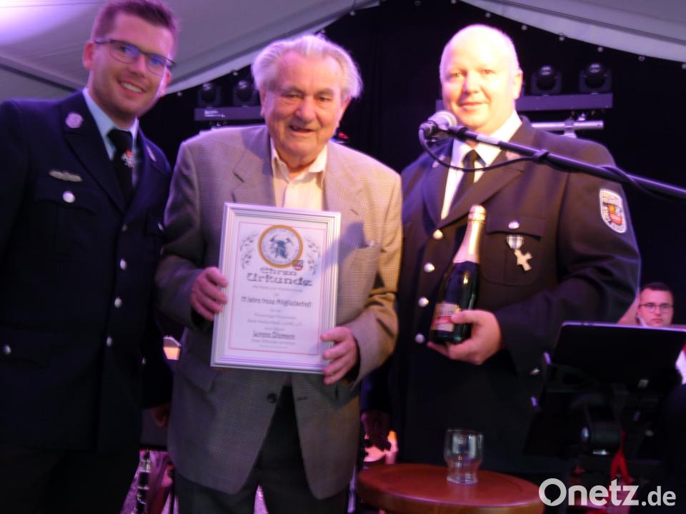 Das Musik- und Comedy-Programm zur 150-Jahr-Feier der Freiwilligen Feuerwehr begann am Samstag mit einem offiziellen Akt. Vorsitzender Thomas Schreml hieß die zahlreich erschienenen Festbesucher willkommen und wandte sich Lorenz Zitzmann zu. Er dankte dem Feuerwehrurgestein für dessen stete Treue zur Selbstschutzorganisation und überreichte ihm als äußeres Zeichen dafür die Ehrenurkunde für 75 Jahre Mitgliedschaft.