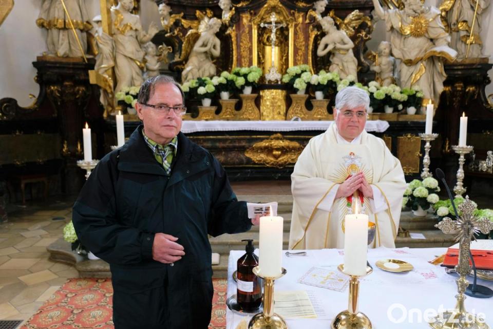 Den folgenden Gottesdienst allein für die Eschenbacher Wallfahrer zelebrierte Stadtpfarrer Thomas Jeschner vor dem Gnadenbild im Altarraum des barocken Kirchenjuwels. Für den Seelsorger war die ungewöhnliche Situation in ungewöhnlichen Zeiten Anlass, die Heilige Dreifaltigkeit um Erhörung der Gebetsanliegen zu bitten. „Wer glaubt, ist nie allein“, betonte der Seelsorger im Rahmen der offiziellen Ablage der Gebetsanliegen durch den Wallfahrtsführer auf dem Altar der Basilika. Ein bewegender Moment für den langjährigen Organisator der Eschenbacher Gößweinsteinwallfahrt. Zudem lobte Jeschner die Bereitschaft von Herbert Körper, stellvertretend für alle Gößweinsteinwallfahrer die Idee der schriftlichen Gebetsanliegen umzusetzen.