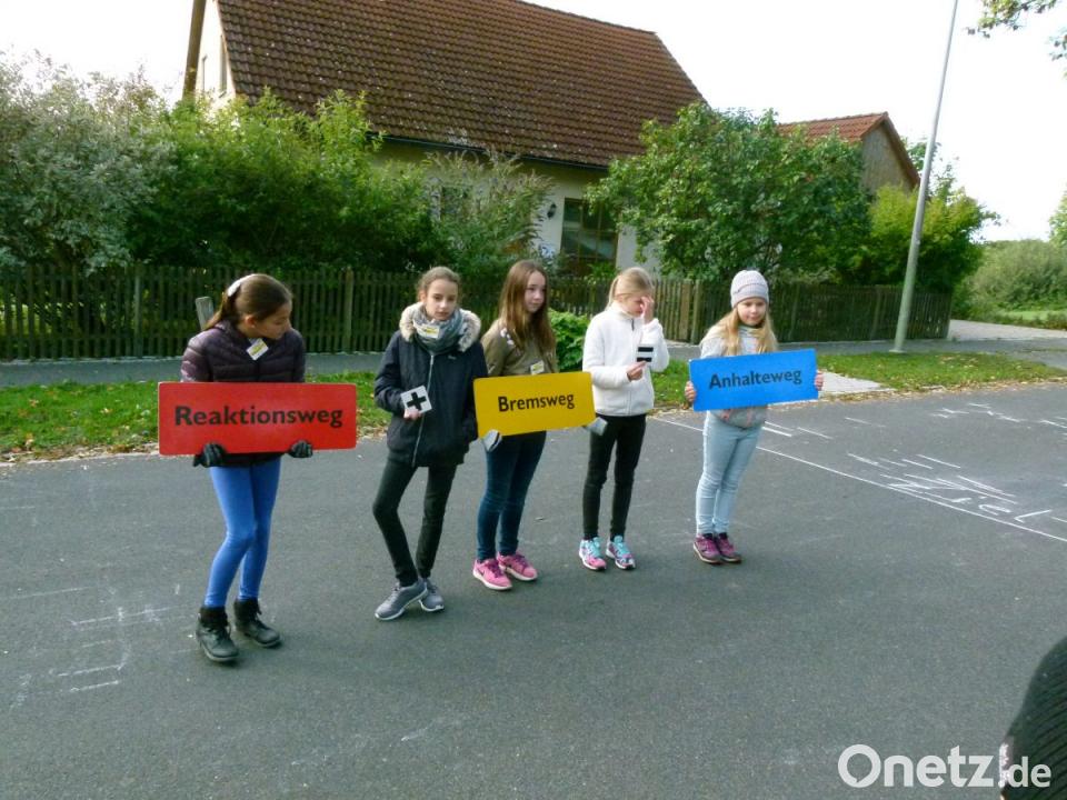 Hauber wählte dabei als Einstieg eine Demonstration mit einem Schüler, der sich ins Handy vertieft auf der Straße bewegt. Die hautnah erlebte Praxis mit Lerneffekten setzte sich fort, als die Schüler aus vollem Lauf an einer Ziellinie stoppen sollten und dabei erkennen mussten, dass sie nicht sofort stehen bleiben können. Noch länger dauerte es, als sie auf ein Flaggenzeichen hin anhalten sollten. Dann stellten die Schüler Pylonen an die Stelle, an der sie das Anhalten eines sich mit 50 Stundenkilometern nähernden Fahrzeugs erwarteten. Wie der praktische Versuch zeigte, unterschätzten sie den Anhalteweg jedoch gewaltig.