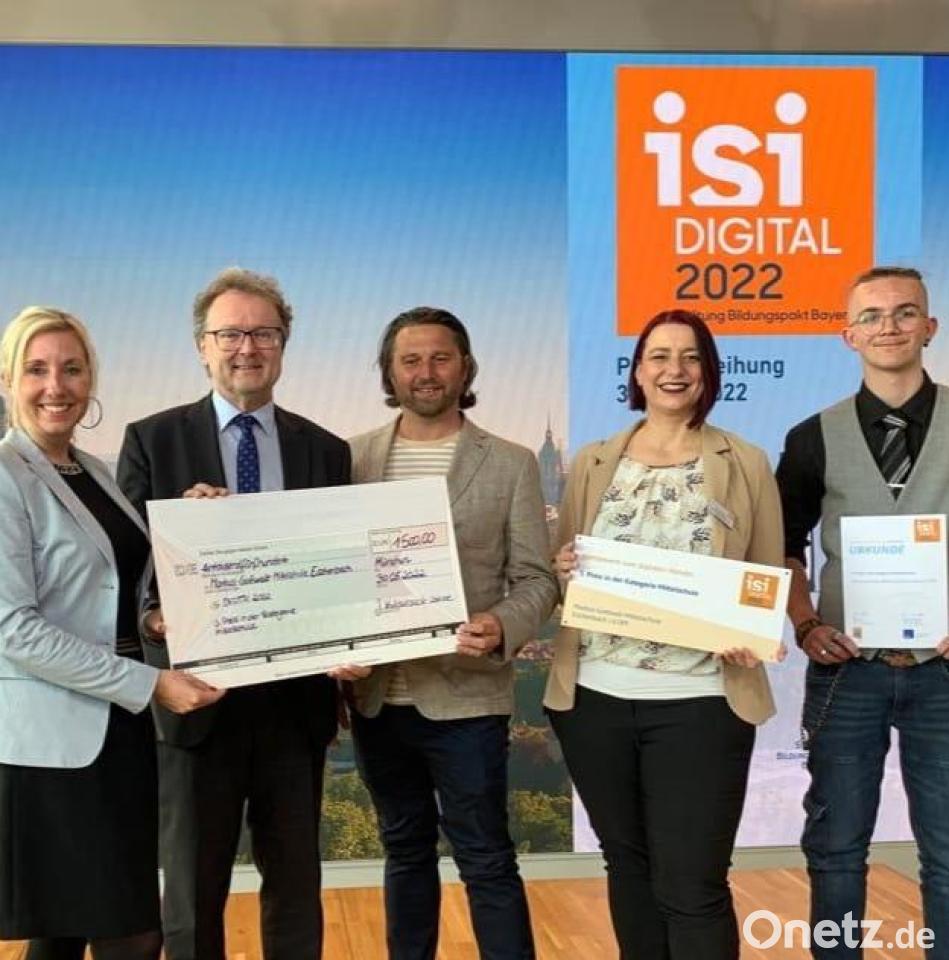 Mit einem 1500-Euro-Scheck kehrten Rektor Wolfgang Bodensteiner, Konrektorin Nicole Gleißner, Systembeauftragter Martin Schmid und Schülervertreter Hannes Göppl aus München zurück. Im Literaturhaus hatte Kultusstaatssekretärin Anna Stolz der Mittelschule der Markus-Gottwalt-Schule einen der Bayerischen Schulinnovationspreise „isi Digital 2022“ verliehen.