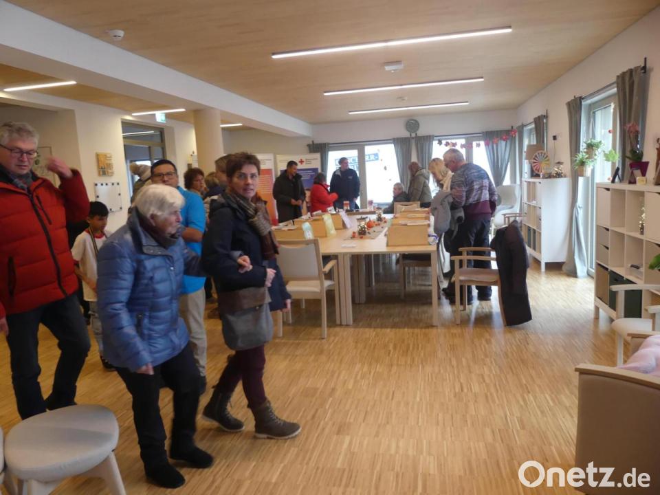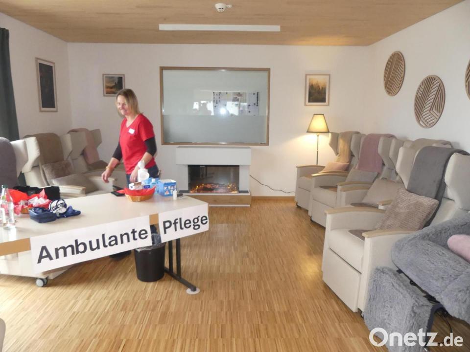 Im Untergeschoss mit Blick zum Rauhen Kulm führten die Räumlichkeiten der Tagespflege zu regen Informationsgesprächen mit Pflegeleiter Martin Hörl und dessen Mitarbeiterinnen. Nahezu Aufsehen erregte das „Wohnzimmer“ mit einem flackernden Kaminfeuer, eine Spende der Sparkassen. Am Demenz-Parcours lockten Stationen mit Alltagssituationen wie Straßenverkehr oder Zubereitung von Frühstück zu Selbstversuchen, die über Fotos verfolgbar waren. Auch Alters-Anzug und -simulator, ausgestattet mit Handschuhen, Brille und Gesichtsmaske, vermittelten Erkenntnisse. Im Erdgeschoss wurden Ruhe- und Umkleideräume für den Rettungsdienst, Duschen, Ruheraum für den Notarzt und das Wäschelager vorgestellt.
