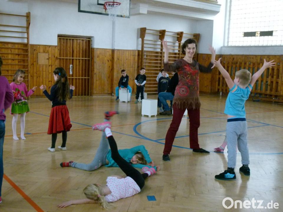 Nicht minder kontaktfördernd waren Bewegungsspiele mit Bewegungen zu Begriffen wie Schwimmen, Skifahren, Fußball, Trommeln oder Basketball sowie der Nachahmung von Bewegungen eines Vortänzers. Besonders elegant erledigten die Mädchen diese Aufgabe. Probleme gab es allerdings, als Straková einen Spagat vormachte. Unterstützt wurde sie bei den Übungen von Alina Riesch, Praktikantin an der MGS. Rektor Wolfgang Bodensteiner forderte schließlich mit Rhythmusgeräten von den Schülern, ebenfalls synchron, Taktgefühl ein.