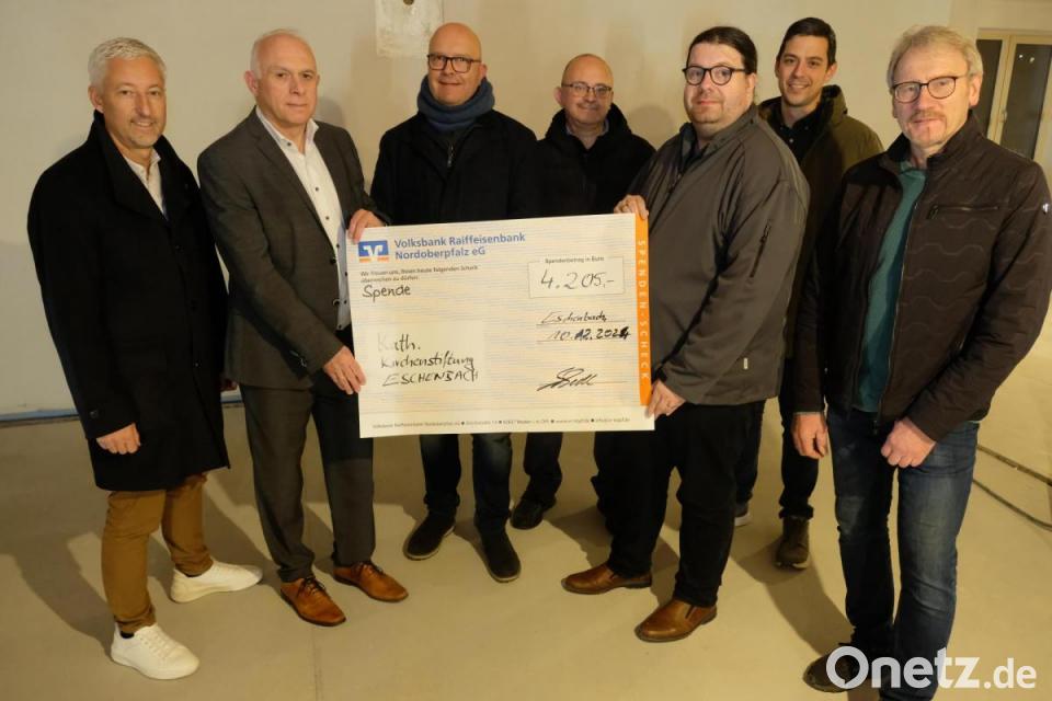 Regionalmarktleiter Stefan Schedl und der Eschenbacher Filialleiter Richard Götz von der VR-Bank überreichten einen symbolischen Scheck. Von der Kirchenverwaltung initiiert und von der Bank unterstützt, freuten sich die Akteure über das Ergebnis der Crowdfunding-Aktion zur Mitfinanzierung der Kücheneinrichtung. Eine Spendenaktion mit einer Spendensumme in Höhe von 4.205 Euro. Die Bank steuerte 2000 Euro bei.