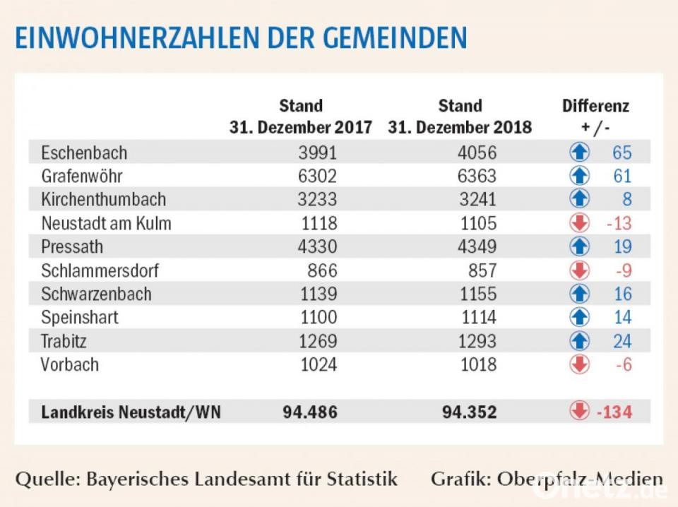 Die Einwohnerzahl im Landkreis Neustadt an der Waldnaab ist im Vergleich der Stichtage 31. Dezember 2017 und 31. Dezember 2018 um 134 gesunken. Die Zahl für den Landkreis liegt nun bei 94.352. Im Vierstädtedreieck inklusive Neustadt am Kulm ist die Zahl dagegen um 179 von 24.372 (2017) auf 24.551 (2018) gestiegen.