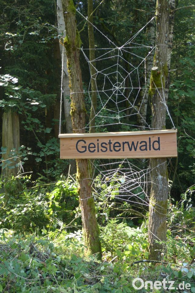 Auf einen weiteren Teil des Forsteinsatzes hatten sich die Waldläufer in Gruppenstunden vorbereitet und dabei Dekorationsobjekte geschaffen. Einen Pfad durch den bereits angelegten "Geisterwald" schmückten die Kinder und Jugendlichen mit eigenen Kunstwerken, die zum Teil auch noch vor Ort zusätzlich angefertigt wurden. Auch den Zugang zum Glasschleifweg ziert nun ein neues Hinweisschild aus der Werkstatt der Eschenbacher.