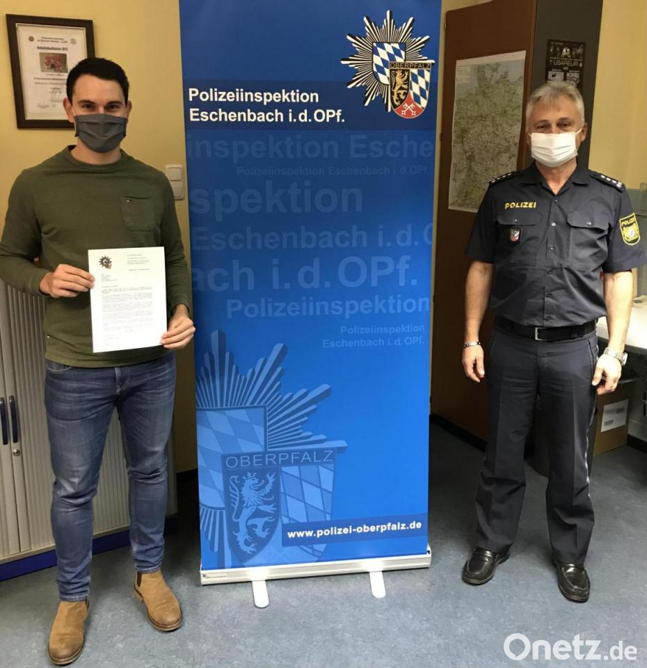 Polizei-Dienststellenleiter Werner Stopfer hob dieses Engagement besonders hervor. Weissels Verhalten „sei sehr lobenswert und mustergültig zugleich“, wie er in den Dankesworten an ihn betonte. Die Polizeiinspektion Eschenbach beantragte deshalb beim Polizeipräsidium Oberpfalz eine kleine Belohnung. Zusammen mit einem persönlichen Dankschreiben von Polizeipräsident Norbert Zink freute sich Fabian Weissel über diese Anerkennung. Für den Filchendorfer war sein Verhalten nichts Besonderes, sondern eine Selbstverständlichkeit, wie er betonte.