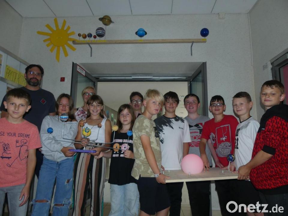 Über viele Wochen hinaus konnten die Schüler der 5. Klasse der Markus-Gottwalt-Schule fordernden Unterricht vergessen. Mit Alexander Putzer, einem „echten Bauleiter“ der Wunsiedeler Firma Roth, bot sich ihnen auf Vermittlung von Maria Rübe-Hitzinger, der Jugendsozialarbeiterin des Kreisjugendamts, die Gelegenheit ein Sonnensystem für ihre Schule anzufertigen. Bei Holz-, Metall- und Malerarbeiten konnten sie ihre kreativen und handwerklichen Fähigkeiten unter Beweis stellen. In der Anfangsphase gaben sie Putzer zu erkennen, wer im familiären Umfeld bereits einmal Werkzeuge wie eine Säge in der Hand hatte. In einem ersten Schritt fügten die Schüler Puzzleteile im 3D-Format zusammen und füllten sie zur Stabilisierung mit Bauschaum. Zurecht sägen mussten sie das Trägersystem aus Metallstäben. Verschiedene Holzkugeln, die als Planeten dienen sollten, waren bunt zu bemalen. Unter Anleitung von Putzer entstand ein bewegliches und starres Sonnensystem. Während der handwerklichen Wochen überraschte sie Putzer im Pausenhof gar mit einem kleinen Bagger, auf dem sie Probesitzen und auch „baggern“ durften und mehr über den Beruf des Baggerfahrers erfuhren.