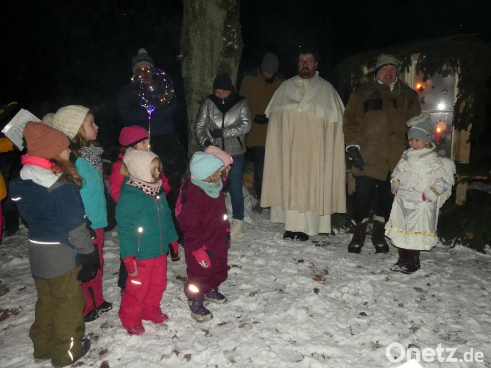 Pfarrer Johannes Bosco erbat für diejenigen, "die nichts mehr hören können vor lauter Weihnachtsgeschrei, die nichts mehr sehen wollen vor lauter falschem Glanz", dass "Engel leise zu ihnen sprechen, damit sie verstehen.“ Die Bläser bereicherten das Geschehen mit Liedern wie „Wir sagen euch an, den lieben Advent“, „Tauet Himmel“, „Macht hoch die Tür“ oder „Süßer die Glocken nie klingen“. An die Feierrunde waren dazu Liedtexte verteilt worden. Ein Christkindl verteilte an eine bisher ausharrende Kinderschar kleine Präsente. Bei Glühwein und Tee ergaben sich rege Plauderrunden.