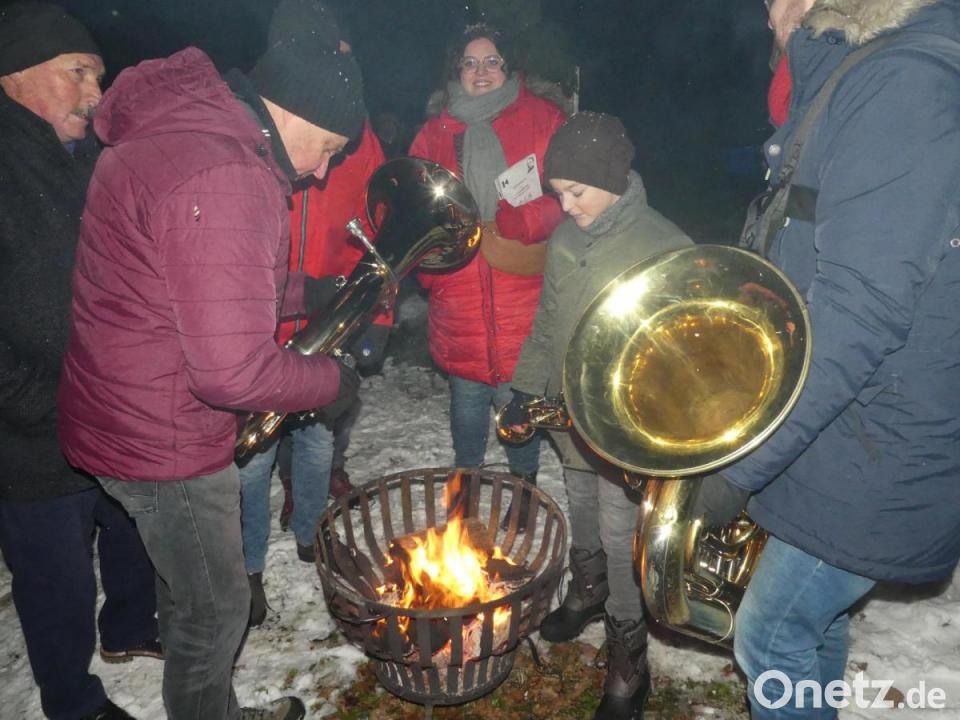 „Komm – mach die Türe auf!“ Unter diesen Leitgedanken stand die Waldweihnacht, zu der die Kolpingfamilie an die Wegegabelung Hotzaberg/Breitenlohe geladen hatte. Ein loderndes Feuer, ein großes beleuchtetes Fenster und das Glitzern von Schnee- und Reifkristallen an den umstehenden Bäumen schufen eine stimmungsvolle Atmosphäre, der ein Bläserensemble eine besondere Note verlieh. Das offene Feuer war auch den Bläsern sehr willkommen. Sie nutzten es zum Anwärmen ihrer Instrumente.