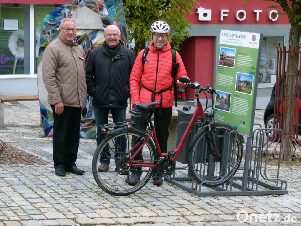 Als passionierter Radler erläuterte zweiter Bürgermeister Karl Lorenz seinen Amtskollegen Peter Lehr und Klaus Lehl die Ladetätigkeit. Er informierte, dass im gesamten Gebiet des Naturparks Oberpfälzer Wald bisher 85 Ladestationen aufgestellt worden seien, davon 31 im Landkreis Neustadt/WN. Lorenz berichtete, dass im Zuge des Leader-Projekts auch eine E-Bike-Karte mit einer Liste aller Standorte erstellt worden sei. Das Bürgermeister-Trio zeigte sich überzeugt, dass die Ladestation insbesondere in der warmen Jahreszeit eine Bereicherung der Innenstadt darstellen werde.