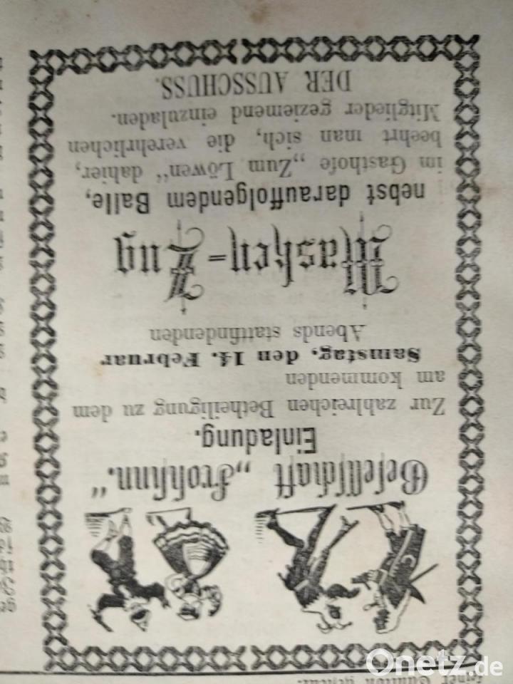 "Die letzten Tage des Faschings sind hier ziemlich bewegt verflossen. Am Samstag Abend veranstaltete die Gesellschaft 'Frohsinn' einen Maskenzug, welcher sowohl in Bezug auf Arrangement, als auch Costümirung (!) nur als sehr gelungen bezeichnet werden muß. Es war ein ganz lieblicher Anblick, die Vertreter so mancher Nationen, dieses und jenes Standes, aus mancherlei Jahrhunderten, bei Fackelschein, bengalischer Beleuchtung unter den Klängen einer frohen Musik, deren Erzeuger gar zu liebenswürdig maskiert waren, in froher Erregung dem Balllokale zumarschiert zu sehen, am Arme die reizende Landsmännin oder sonst etwas dergleichen. Der dem Maskenzuge folgende Ball verlief in schönster Ordnung, da außer für die Befriedigung der Tanzlust auch für des Leibes übrige Bedürfniße (!) bestens gesorgt war.