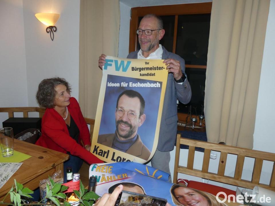 Hohe Wertschätzung bescheinigte Ortsvorsitzender Thomas Riedl seinem Mentor und Freund, der in allen Situationen stets Ruhe bewahrt habe. Zur Ehrung verlas Hans-Martin Grötsch die von Hubert Eiwanger unterzeichnete Urkunde und steckte ihm die Ehrennadel in Platin an. In seiner kurzen Dankrede zeigte sich Lorenz „total überwältigt“ und versicherte: „Mir hat Kommunalpolitik stets Spaß gemacht.“ Er erinnerte an seine erste Sitzung im Stadtrat, bei er als Neuer auch angeschrien wurde. Gefruchtet habe jedoch seine Erwiderung: „Ich hör sehr gut, es geht auch leise.“ Lorenz rief dazu auf, mehr Vorschläge in den Kreistag einzubringen und versicherte: „Ich bleibe bei den Freien Wählern.“ Zu den Erinnerungen an seinen Start bei den Freien Wählern gehörten Äußerungen bei einer CSU-Versammlung in Roding, die ihn veranlasst hatten, sich „von der CSU abzuwenden“. Große Aufmerksamkeit fanden Plakate aus der Anfangszeit seiner Kommunalpolitik in Eschenbach.