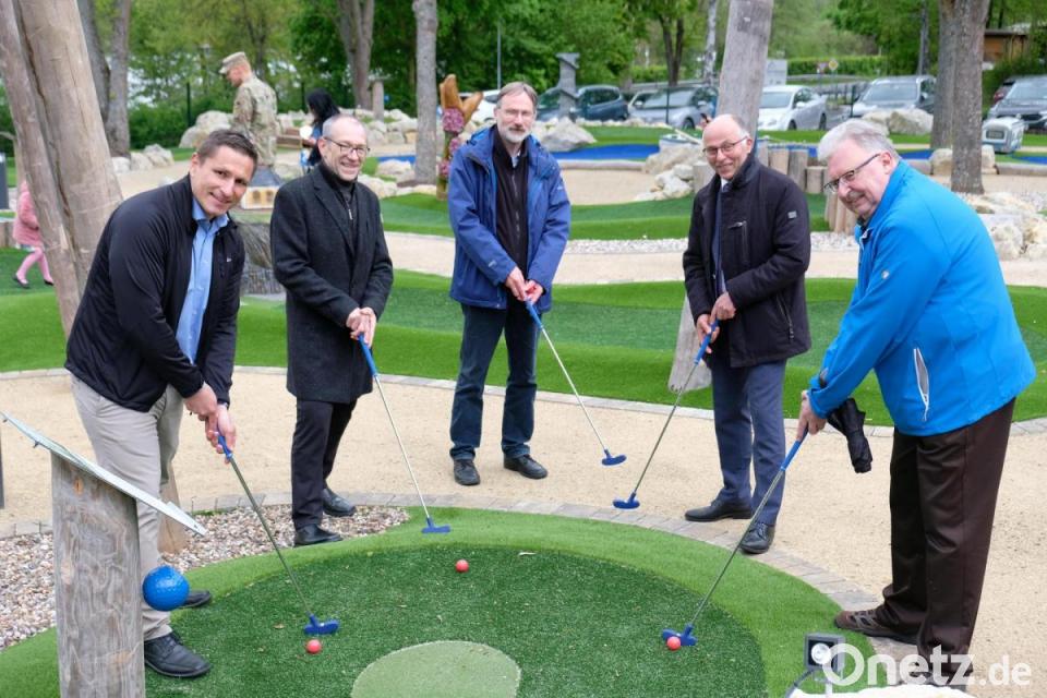 Vor der Segnung durch Stadtpfarrer und Dekan Thomas Jeschner skizzierte Bürgermeister Marcus Gradl noch einmal den Weg des Projekts von der Idee bis zur Verwirklichung und dankte einer Vielzahl an Beteiligten. Zu den Ehrengästen der Eröffnungszeremonie zählten auch die Vertreter des Planungsbüros Manfred Neidl aus Sulzbach-Rosenberg und der Baufirma „Mark Loerke-Golfprojekt Bamberg“, US-Garrison-Commander Colonel Christopher Danbeck, LTC Joshua Brown von der US-Pateneinheit, Andreas Peterek vom Geopark Bayern-Böhmen und Landrat-Stellvertreter Albert Nickl.