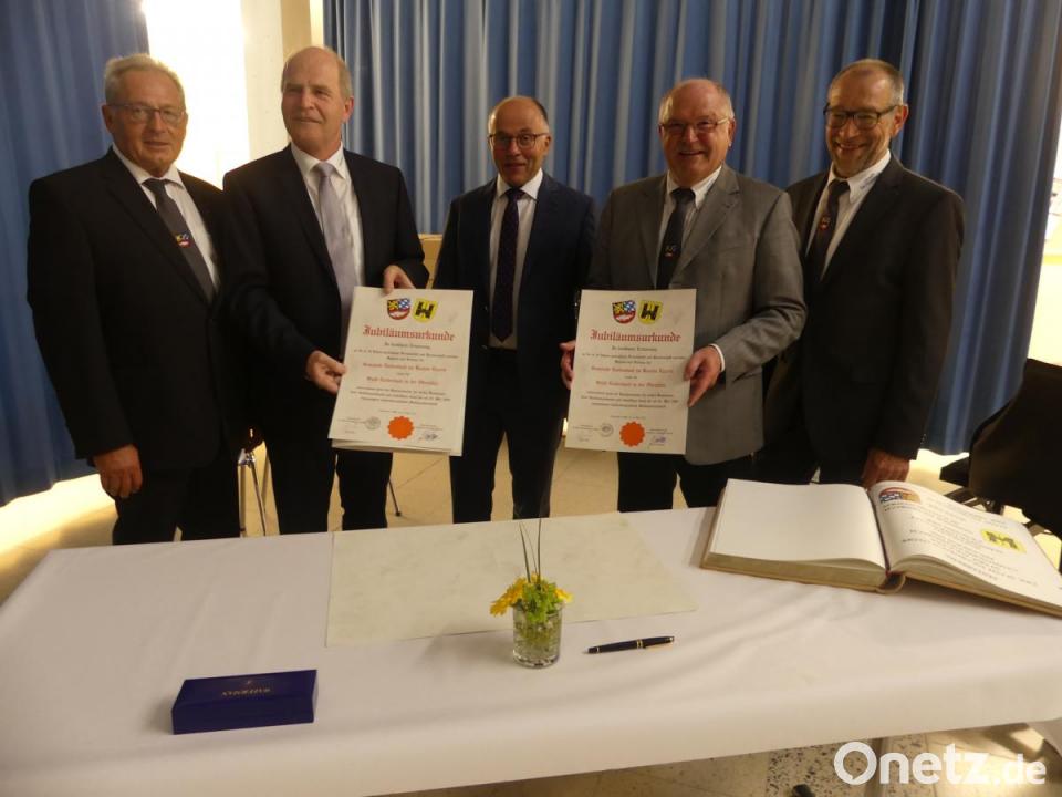Unter „Aufsicht“ von Albert Nickl, Karl Lorenz und Klaus Lehl unterzeichneten Guido Portmann und Peter Lehr dann die Jubiläumsurkunde zur Partnerschaft und trugen sich ins Goldene Buch der Stadt ein. Ihrem Beispiel folgten im Laufe des Abends alle Anwesenden.