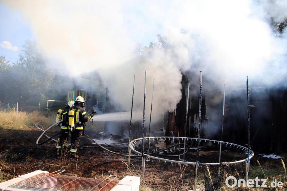 Weil in der Nähe Hecken und Büsche stehen, mussten die Feurwehrleute schnell handeln und rückten mit Atemschutz vor. So konnten sie das weitere Ausbreiten der Flammen verhindern. Probleme machte die Wasserversorgung, da es in diesem Bereich keine Hydranten gab. Die Gartenhütte brannte komplett aus. Ebenso wurden mehrere Spielgeräte im Garten von den Flammen zerstört.